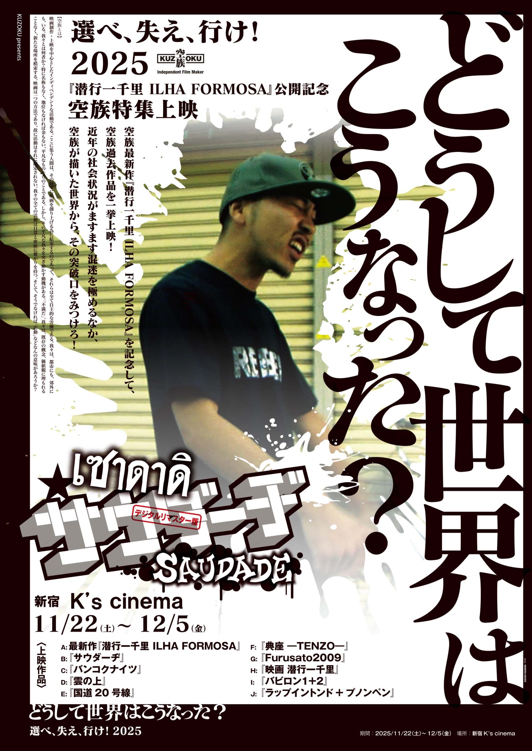 全作品未ソフト化『サウダーヂ』、『バンコクナイツ』、『国道20号線』、『典座 -TENZO-』ほか空族11作品を一挙上映。『サウダーヂ』上映時にはリマスター版公開の2021年に制作した「サウダーヂ2の為の長い予告編」も併映されます。これを逃すと観ることが難しい貴重な作品群を是非お見逃しないようご覧ください。