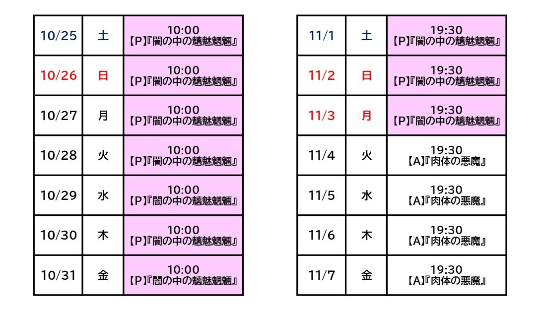 | 当日料金 | 「闇の中~」一般:1,800円/大学・高校:1,500円/シニア:1,200円/小中学生・障がい者(同伴者1名まで):各1,000円 「ちんなねぇ」1,200円均一 |